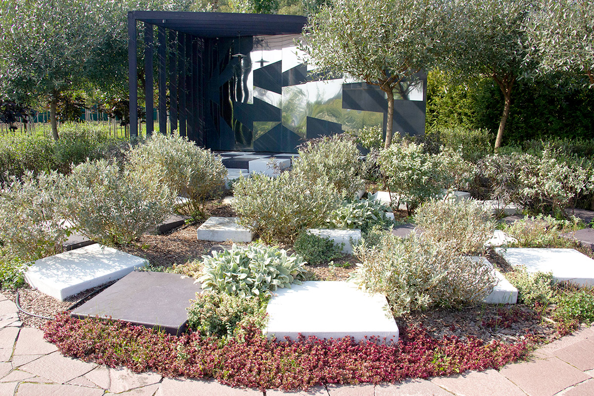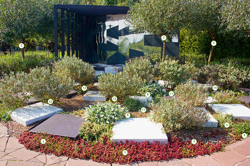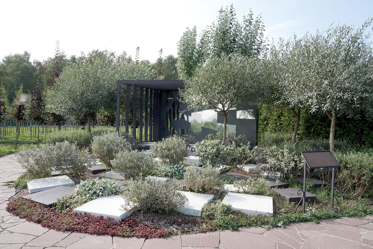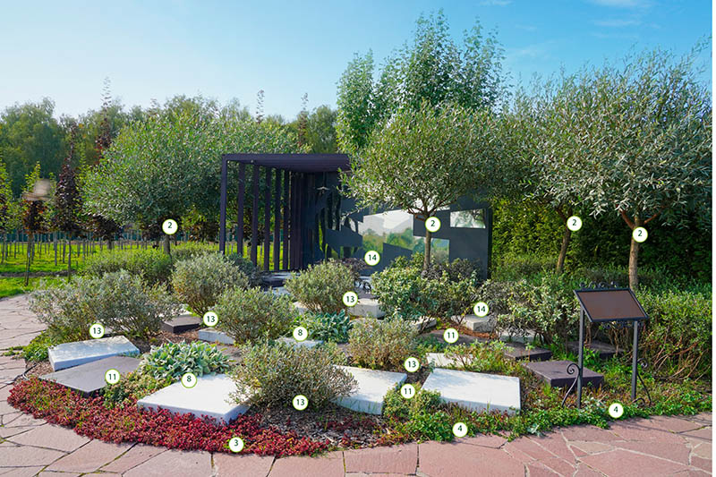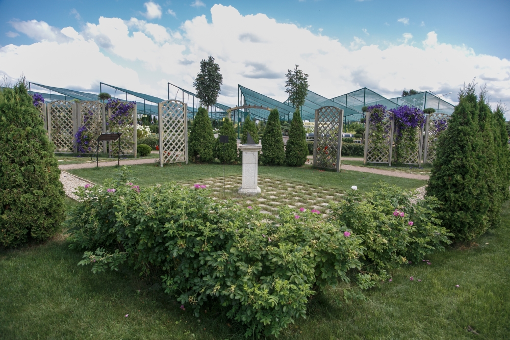 В основе этого сада лежит квадрат. Квадратные сегменты арочных пергол и декоративных решеток увиты лианами, дорожки, образуя квадрат, приводят к солнечным часам, расположенным на постаменте. Низкорослые растения не закрывают солнечный свет, и тень от треугольника гномона часов в ясный день всегда укажет на циферблате истинное солнечное время.
