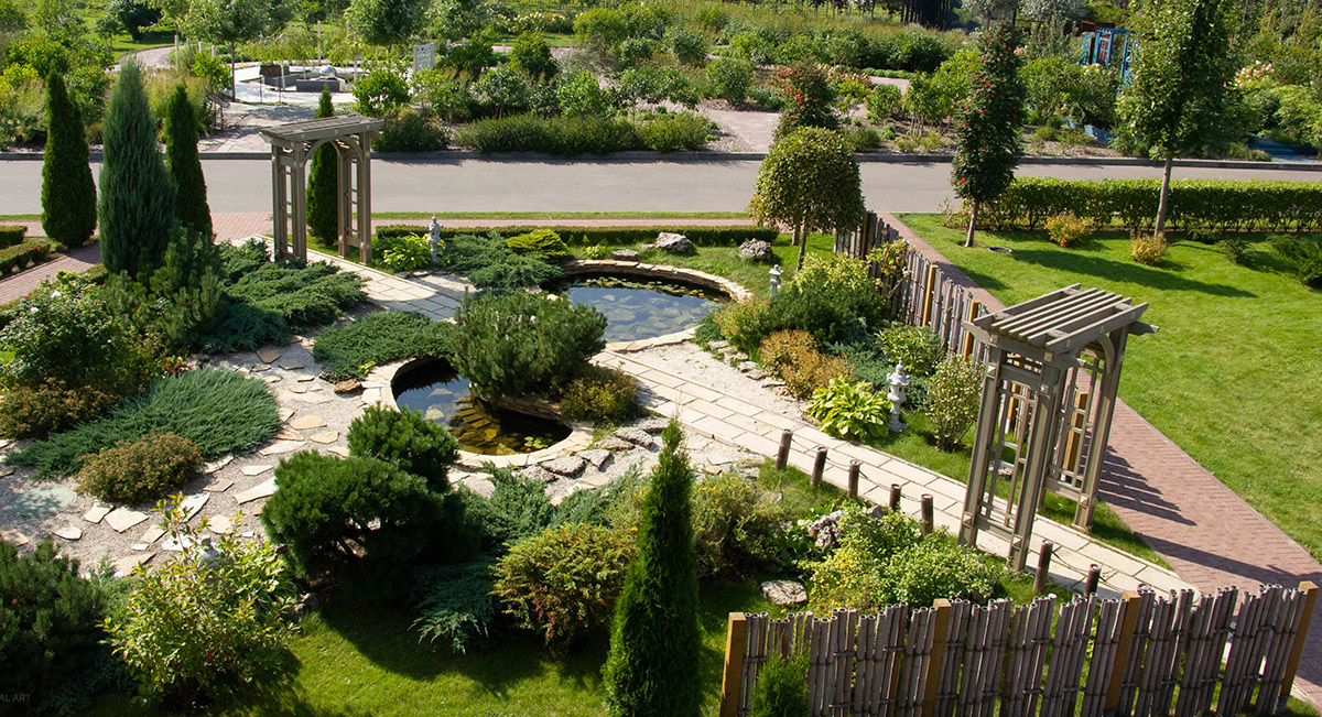 Художественная гармония этого сада основана на древних Японских традициях – символизировать уменьшенные природные ландшафты. Камни имитируют горы, гравийные покрытия и небольшой пруд – реки и озера, гранитные фонарики – огонь, а деревья и кустарники – лесные куртины. Человек является пятым, самым важным духовным элементом сада. Скамья, расположенная в нише бамбуковой изгороди, ждет того, кто раскроет тайну сада и раскроет законы мироздания.